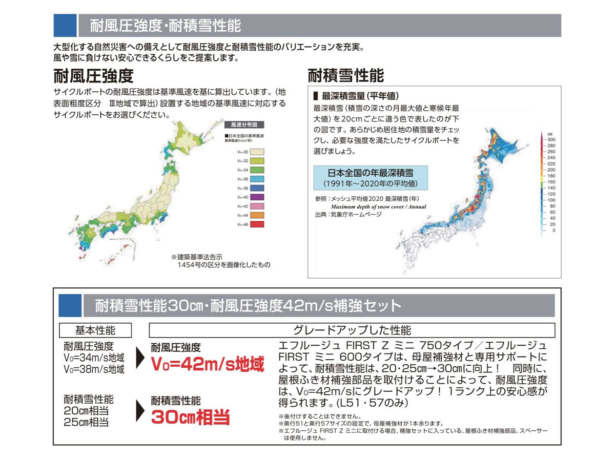 エフルージュ FIRST ミニ 600タイプ 単体はフラット屋根のスタンダードな片流れのサイクルポート(駐輪場屋根)です。基準風速Vo=34m/s・耐積雪性能20cm相当の基本性能があり、約3〜9台が駐輪可能です(自転車1台分を約600mmとして計算)。