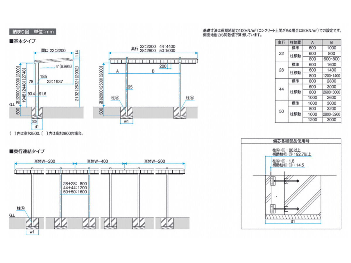 | 屋根高タイプ | 標準柱仕様(有効高 約2,000mm) / ロング柱仕様(有効高 約2,500mm) / ハイロング柱仕様(有効高 約2,800mm) |