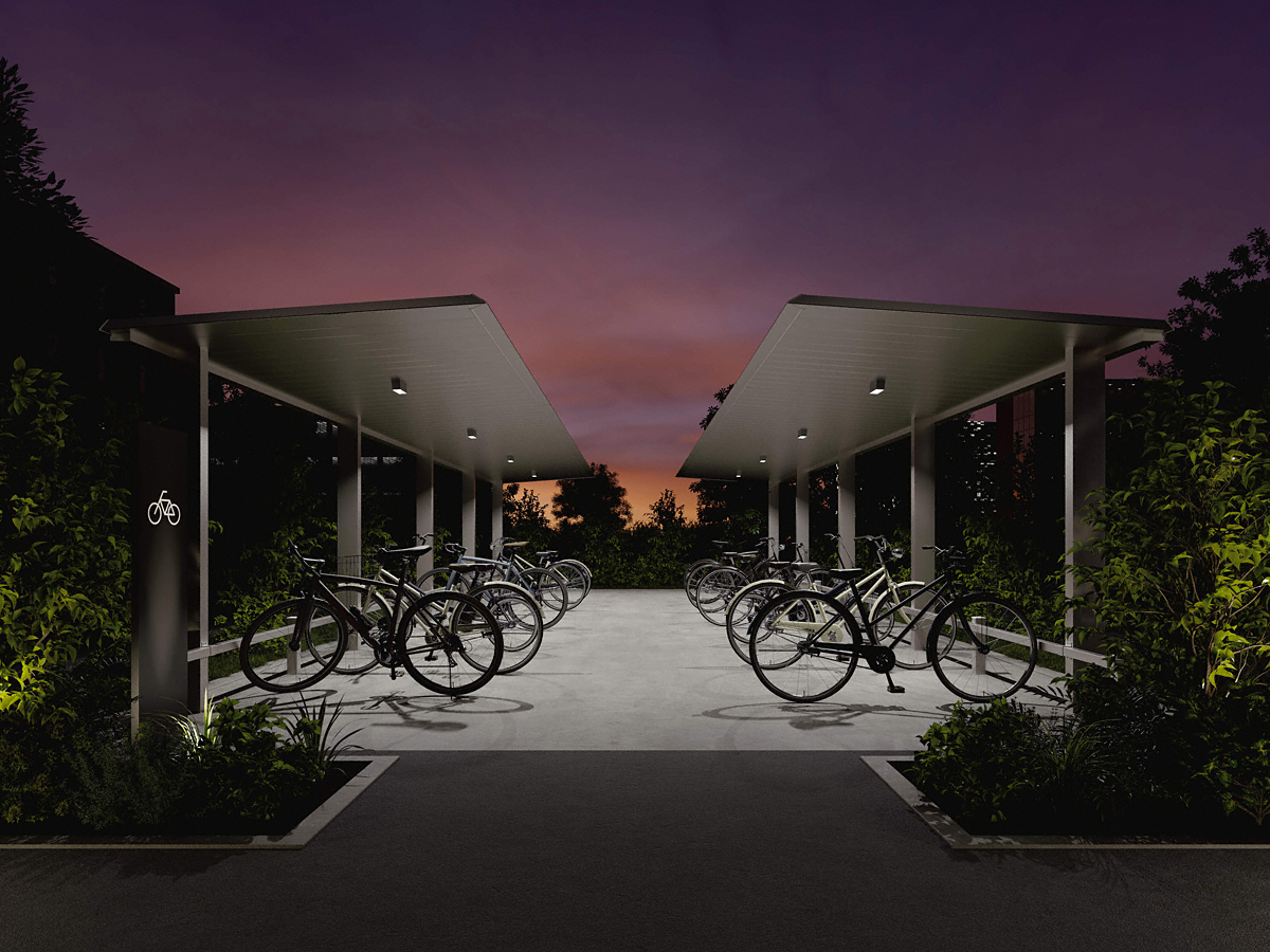 サイクルポートFUリンクロス オープンタイプ 連結タイプ 耐積雪量50cmは天井がアルミ形材の駐輪場屋根です。梁形状にこだわったフラットな新構造屋根や幅わずか95mmのシャープな柱が特徴です。耐久性は基準風速Vo=38m/s・耐積雪荷重1500N/uとなっています。
