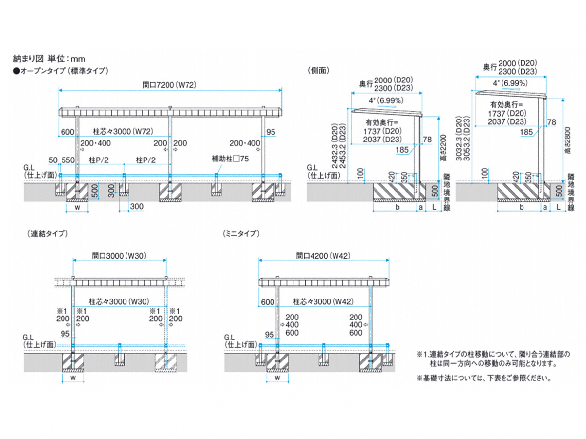 | 屋根高タイプ | 標準柱仕様(有効高 約2,000mm) / ハイロング柱仕様(有効高 約2,800mm) |