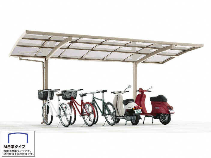 2015年8月を持って販売終了の予定です。後継カーポートの新商品「ネスカRミニ (ラウンドスタイル) M合掌」をご覧ください。 緩やかなカーブラインが描くシンプルなデザインが人気です!自転車やバイクを雨や汚れからしっかり守ります。マンションやアパートの駐輪場にも最適の合掌サイズ!