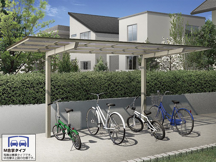スタイリッシュなサイクルポートの中央部分を連結したサイクルポート。合掌したサイズになると駐輪用としてだけではなく通路分も確保できます。そのほか屋根が必要な場合にサイズに合わせて活用が可能です。