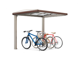 屋根の形状がアーチ状で屋根枠に木目調のラインが入った、柔らかいデザインのサイクルポートです。