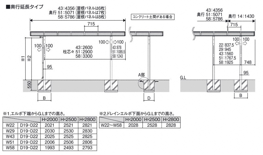 | 屋根高タイプ | 標準柱仕様(有効高 約2,000mm) / ロング柱仕様(有効高 約2,500mm) / ハイロング柱仕様(有効高 約2,800mm) |