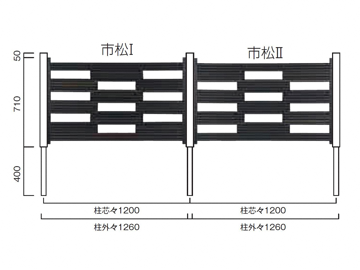 樹脂竹の加工性の高さを生かしたオリジナルのデザインで表裏のない文様シリーズのフェンス「市松モダン」。横に長さの異なる樹脂竹幅を積み上げて市松模様にした、和モダンなお庭にぴったりな竹垣状のフェンスです。幅は柱外々1,260mm、高さは約760mmで特注対応も可能です。2種類の色からお選びいただけます。