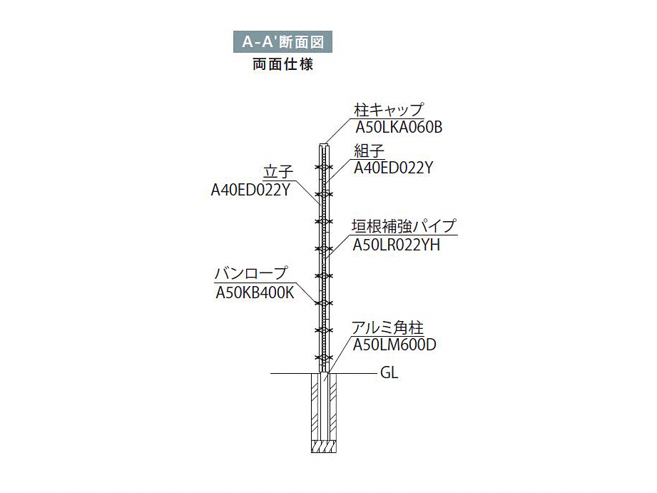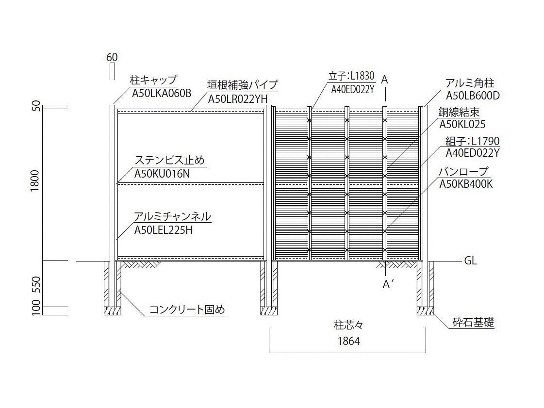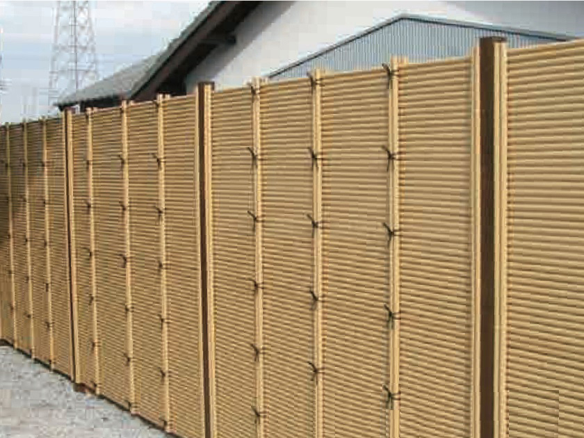 直径22mmの丸竹を横に積み上げたデザインで、目隠し効果がある竹垣状のフェンスです。丸竹風の胴縁が竹一色の面を作りつつも柱が見えるタイプなので、単調ではない竹の塀になっています。丸竹は耐久性と耐候性に優れた樹脂製なので、メンテナンスも楽で長持ちします。高さは約1,200、約1,500、約1,800mmの3種類があり、特注寸法の対応も可能です。丸竹の風合いも2種類からお選びいただけます。