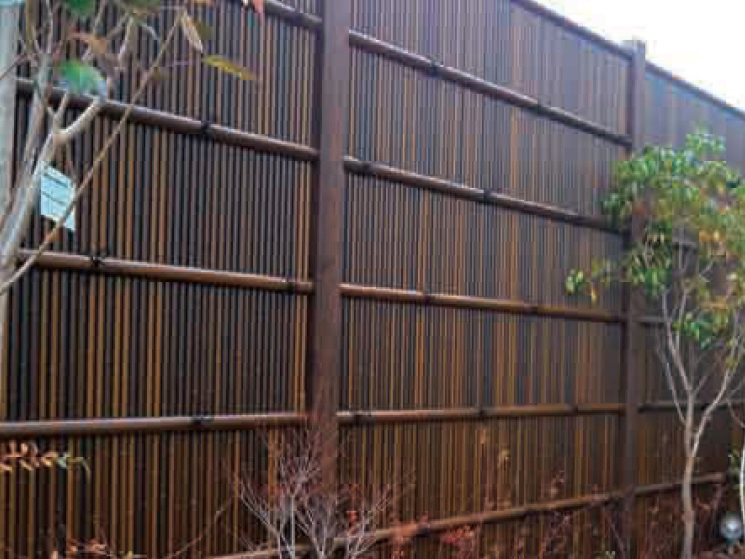 「竹演セット19 清水垣セット」は、直径22mmの丸竹を縦に並べたデザインで、目隠し効果がある竹垣状のフェンスです。1本ずつ丸竹を並べた質感はパネルとは違い、より天然竹に近い質感があります。丸竹は耐久性と耐候性に優れた樹脂製なので、メンテナンスも楽で長持ちします。高さは約1,800mmの1種類で、特注寸法の対応も可能です。丸竹の風合いも2種類からお選びいただけます。