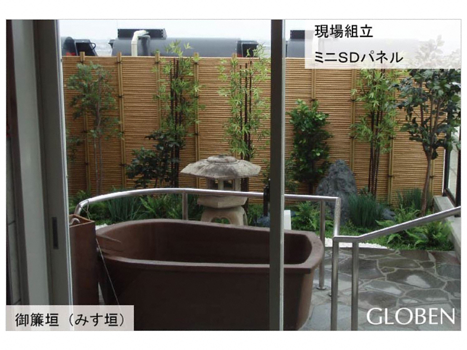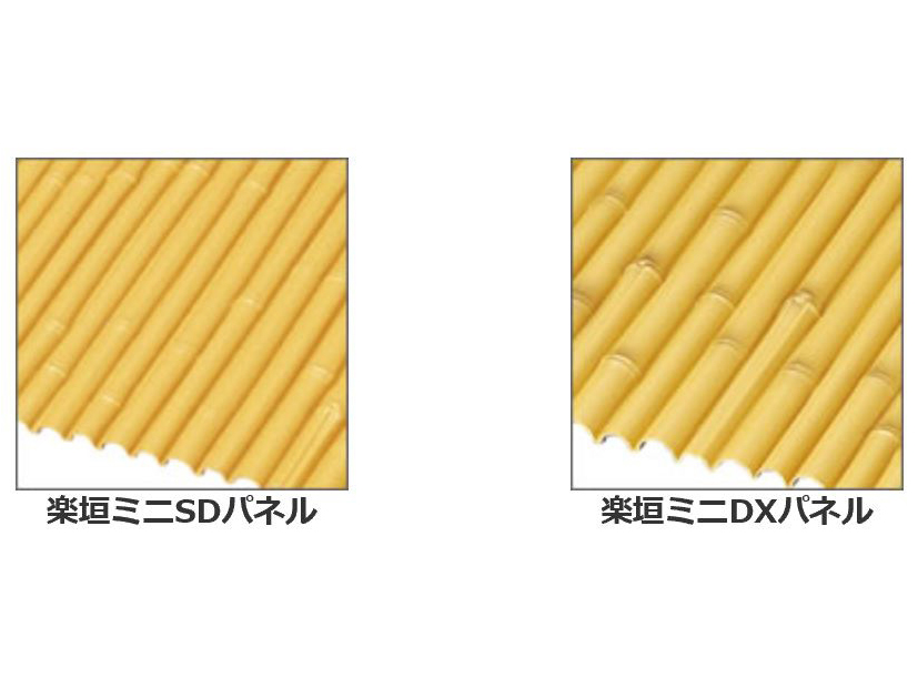 「竹演セット7 みす垣セット」は、すき間なく竹を横に並べたパネルで目隠し効果が高い、竹垣状のフェンスです。植栽の緑にもよく合い、和風の庭園を囲う塀にピッタリです。パネルの竹は耐久性と耐候性に優れた樹脂製なので、メンテナンスも楽で長持ちします。高さは約1,800mmの1種類があり、特注寸法の対応も可能です。パネルの竹の風合いは2種類からお選びいただけます。