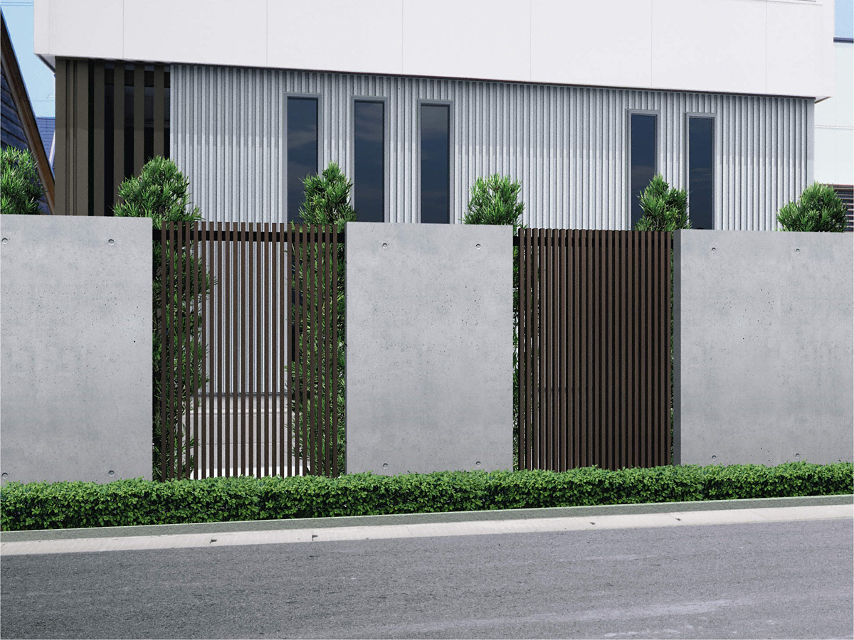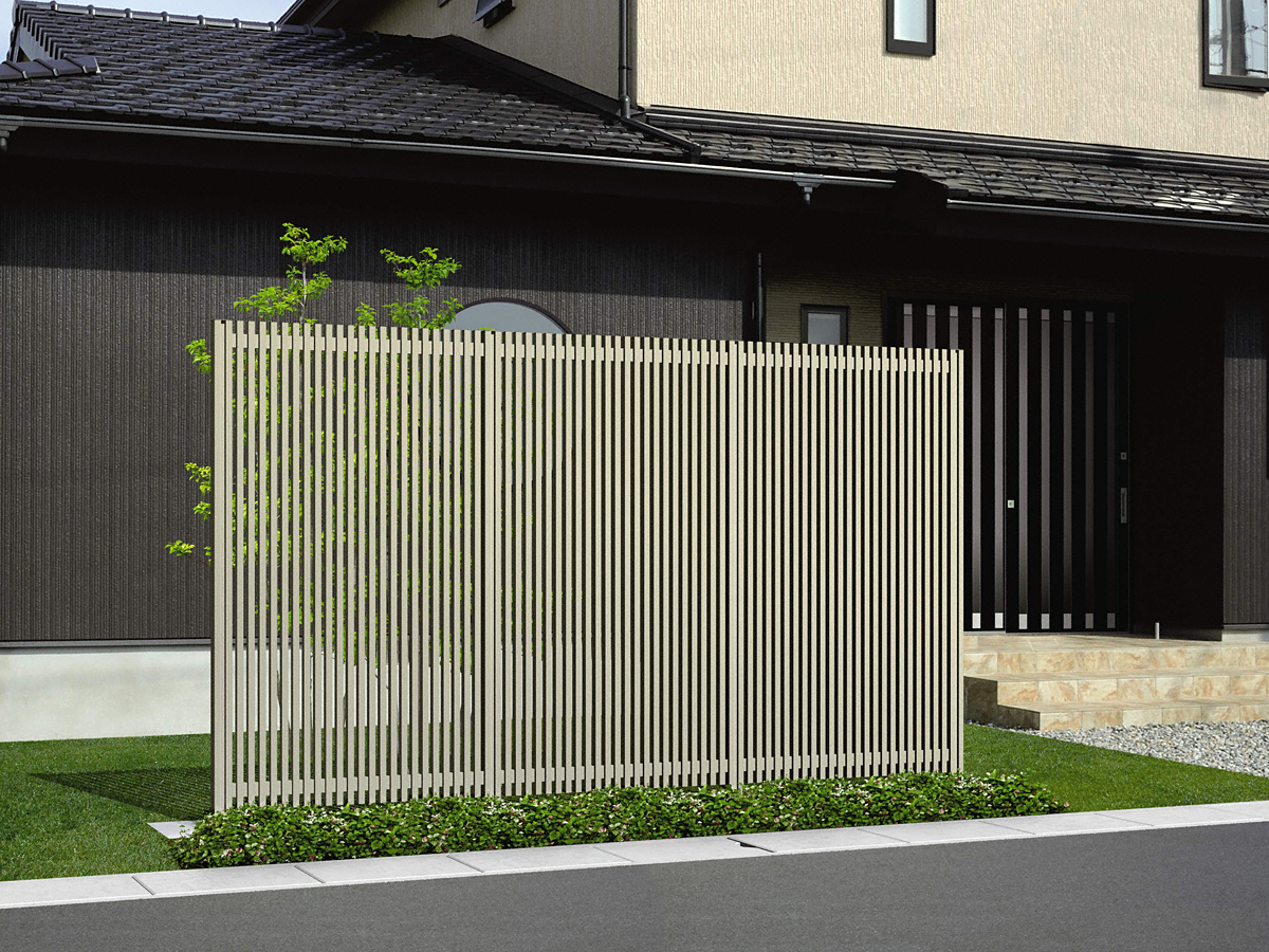 ガーデンスクリーン J.モダン1型 木調色は内側面が台形状になっている細目格子のスクリーンフェンスです。採光・通風しつつ30〜45°の斜め方向からの視線を遮断できます。本体色はモダンなアルミカラーのアーバングレーと浮造り調を表現した木調カラーのビターグレインがあります。