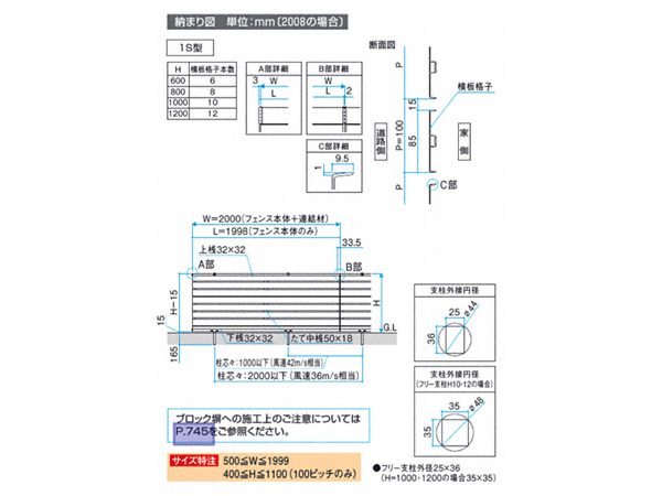 形材フェンス シャトレナU 1S型 横板格子下桟すき間小 片面木調 スタンダードタイプは下桟すき間が通常80mmのところを15mmに狭くした上下桟が形材色のアルミフェンスです。耐風圧強度は従来品の約1.2倍(三協アルミ社標準比)の風速36m/s相当で、目隠し率は1S型・2S型:87.4%/3S型:100%です。
