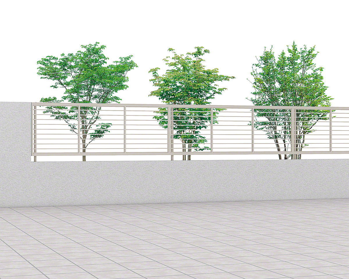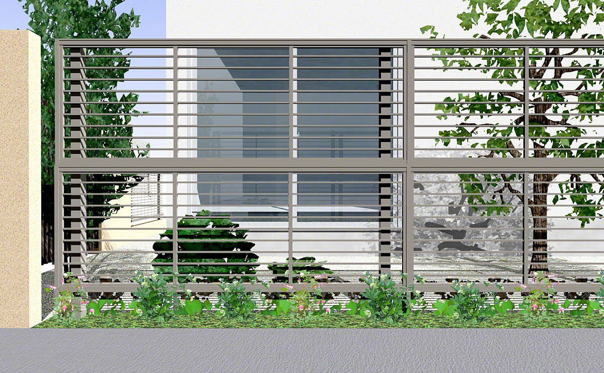 プレスタフェンス 1型は細横桟のフェンスデザイン、正面から見たときの透過率は約72%です。横桟が一直線に走るすっきりとしたフェンスデザインなのでオープン外構や長距離にわたる境界部分設置に適したデザインフェンスです。長尺の柱を使用し2段施工で高さも思いのまま。上下で違うデザインの組み合わせも可能です。都道府県で探す