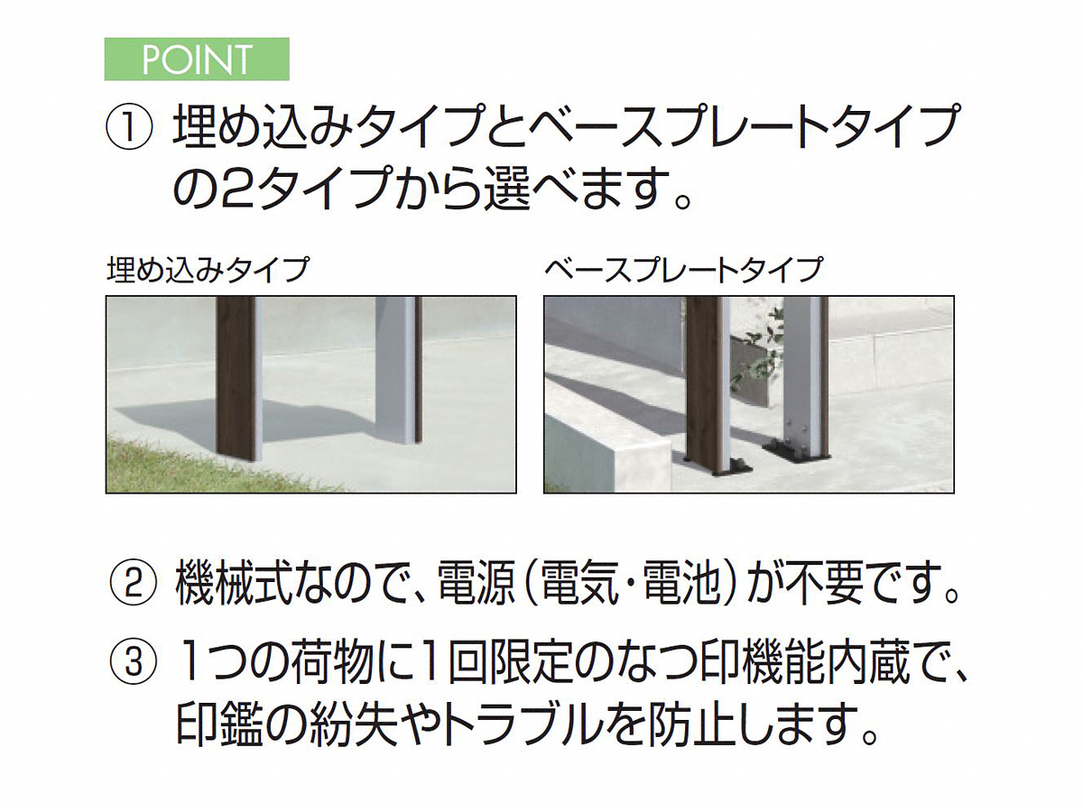 宅配ボックス フレムスClassic(クラシック) ポールベースプレートタイプ ミドルタイプは不在時も荷物受取が可能なスタイリッシュな宅配ボックスです。機械式のため電源(電気・電池)要らずで、1個の荷物につき1回のみ捺印できる機能が内蔵されています。