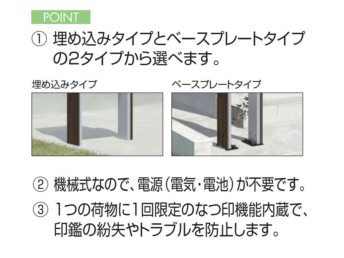 宅配ボックス フレムスClassic(クラシック) ポール埋め込みタイプ スリムタイプ 複合色は外出中にも荷物受取ができるシンプルな宅配ボックスです。電源(電気・電池)不要の機械式&1荷物に1回限りの捺印機能という、簡易的ながら安全性の高い機能が備わっています。