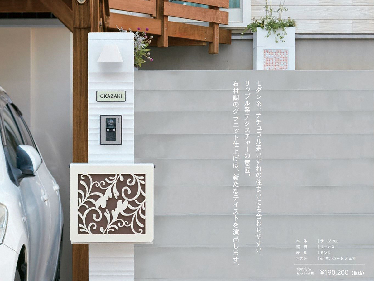 門柱にあらたな「波」、分譲向けスリム門柱。モダン系、ナチュラル系いずれの住まいにも合わせやすい、リップル系テクスチャーの意匠。