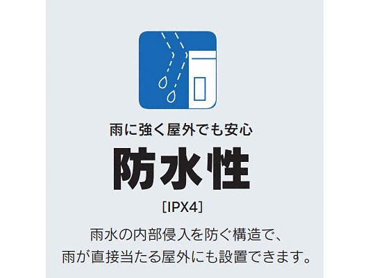 錆びの発生を抑える全溶接構造で、扉底面部に水が溜まらない傾斜構造など錆に強い数々の工夫がこなされています。IPX4の防水性能、風速60m/sの強風にも耐えられる堅牢な構造です。