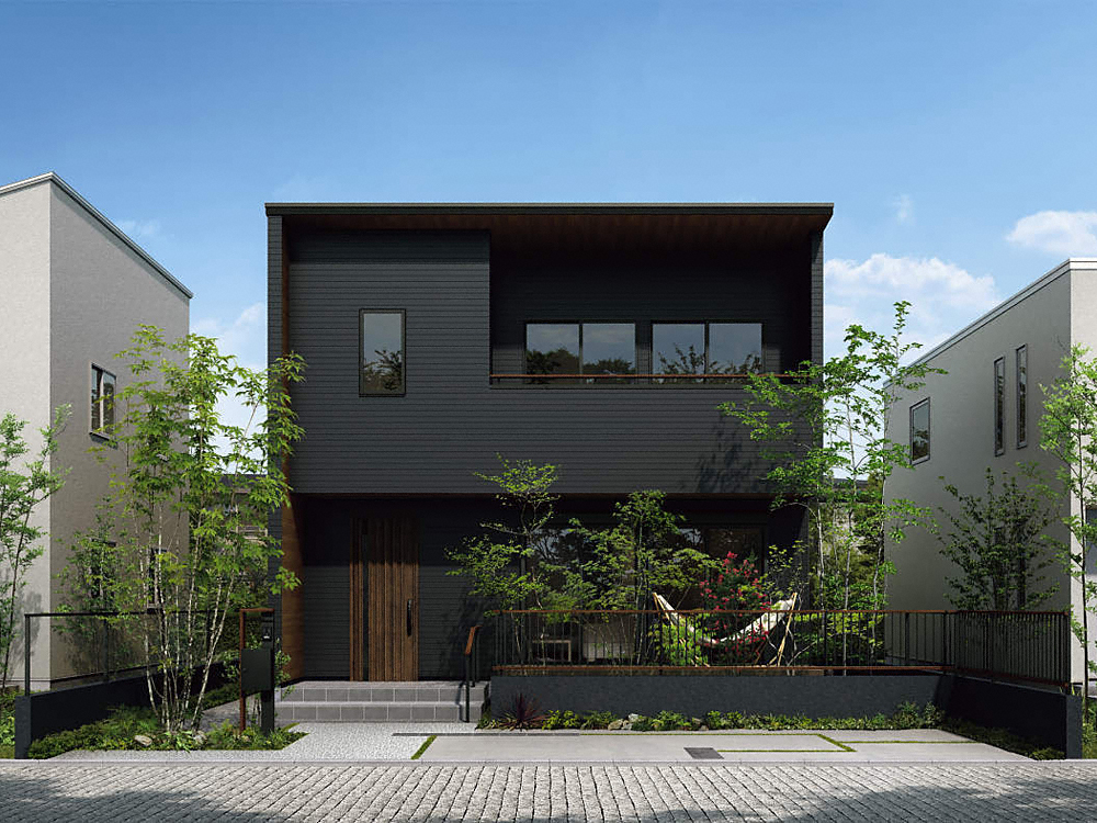 ルシアス ポストユニット HD01型 組合せ例2はフレーム型の本体(表札灯タイプ)と横型のエクステリアポストT13型を組み合わせたポストユニットです。たてパネル・エクステリアポストはカームブラックの配色となっており、L字笠木部分は3つの木調色からお選びいただけます。