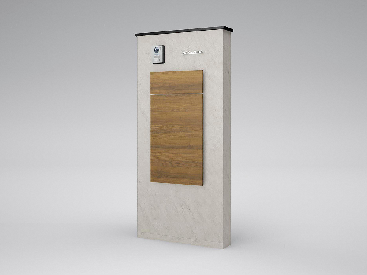 機能門柱FK 組み合わせ例 2は省施工設計の壁本体(ボックスセット仕様)とフレーム(アルミ形材色)とボックスセットKN(木調色)を組み合わせた機能門柱です。ボックスセットKNはエクスポストKN+宅配ボックスKNの構成で、ポストはメール便最大サイズ・宅配ボックスは120サイズが受取可能。