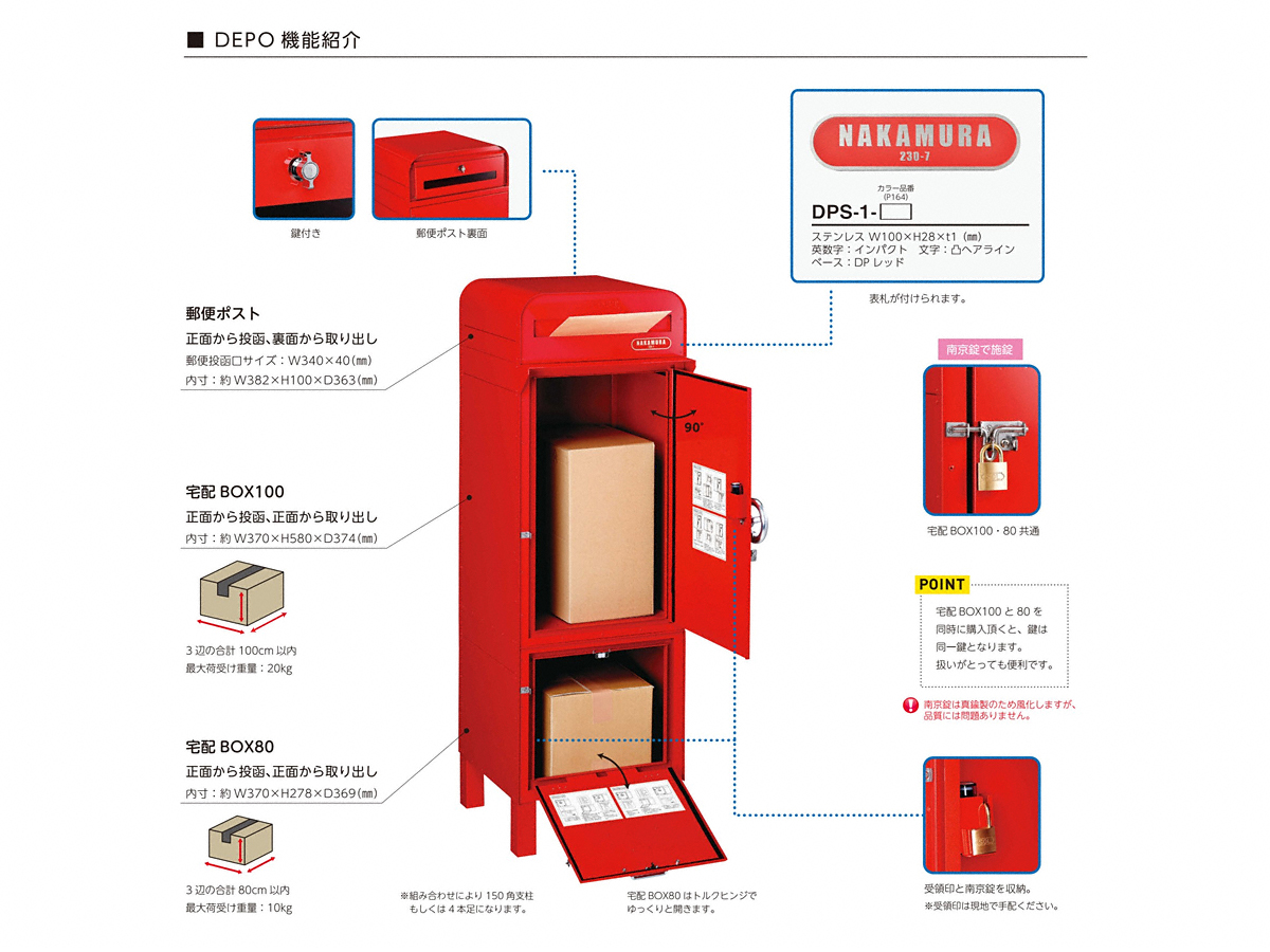 デポ ポスト+宅配BOX80は郵便ポストと宅配BOXを組み合わせたレトロ調の宅配ボックスです。ポストは正面投函・裏面取り出し仕様で大型配達物を入れられます。宅配BOXは正面投函・正面取り出し仕様でBOX100は飲料2L×9本などの大きい荷物、BOX80はCDや書籍など小さい荷物の荷受けが可能です。