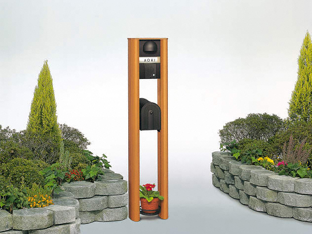 都市型住宅に調和するスリムタイプの木目調2本柱機能ポール。独立仕様のほか、門柱仕様パーツを組合せることで、スタンダード門扉の吊り込みも可能です。