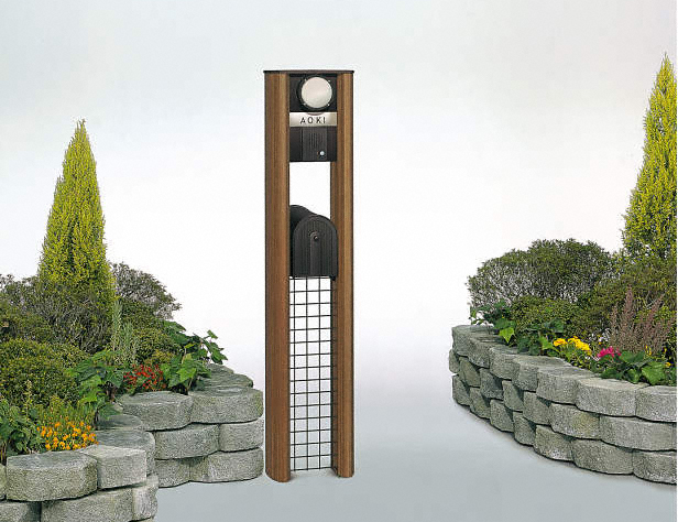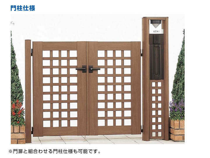 都市型住宅に調和するスリムタイプの木目調2本柱機能ポール。独立仕様のほか、門柱仕様パーツを組合せることで、スタンダード門扉の吊り込みも可能です。