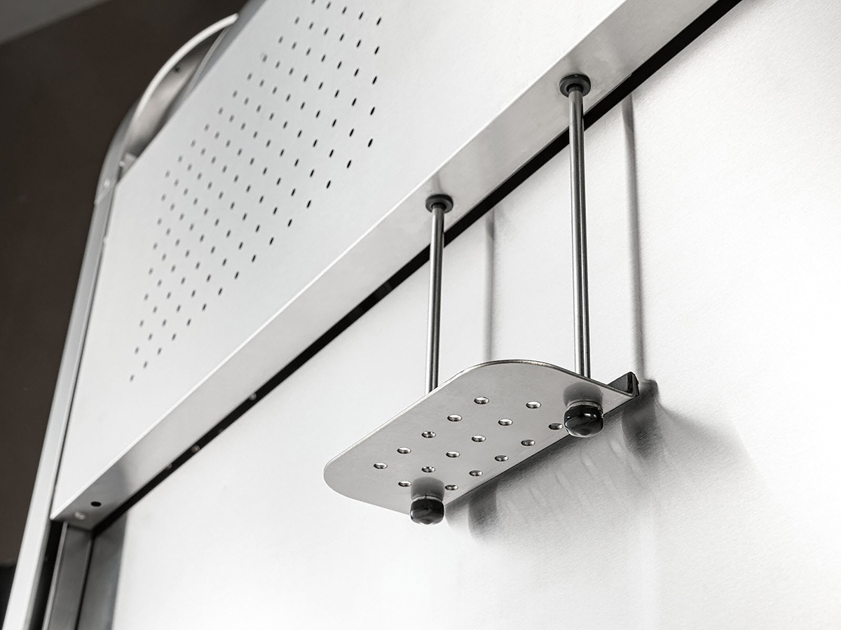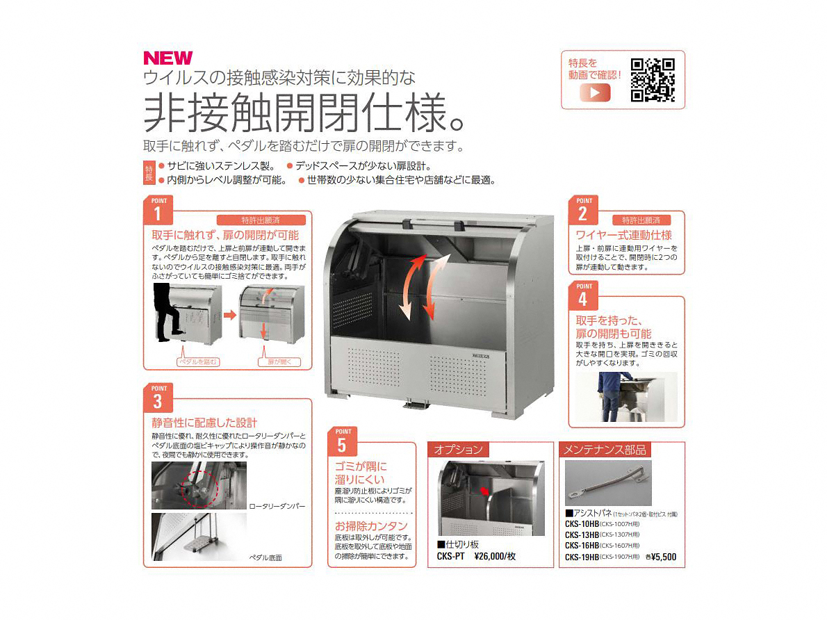 新仕様の非接触開閉仕様を搭載したゴミ収集庫です。ペダルを踏むだけの簡単操作で扉の開閉が可能になりました。両手がふさがっていても安心の新設設計となっています。