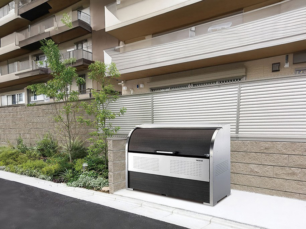 ゴミ収集庫クリーンストッカー CKS-1307-MS型(容量800L)はステンレス×木目調デザインのゴミステーションです。前扉は上下可動式で中身を取り出しやすく、上扉はロータリーダンパー搭載で開閉音が非搭載時より約25%低減されています。木目部分は優れた耐候性がある塩ビシートを採用。