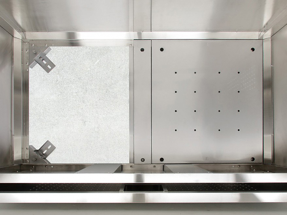 ゴミ収集庫クリーンストッカー CKS-1607-RS2型(容量1000L)は表面にリン酸処理柄シートを使用したゴミステーションです。上扉には耐久力のあるロータリーダンパーが標準装備されており、非装備時と比べて開閉音が約25%低減。また、内側はゴミや埃が隅に溜りにくい塵溜り防止板付きです。