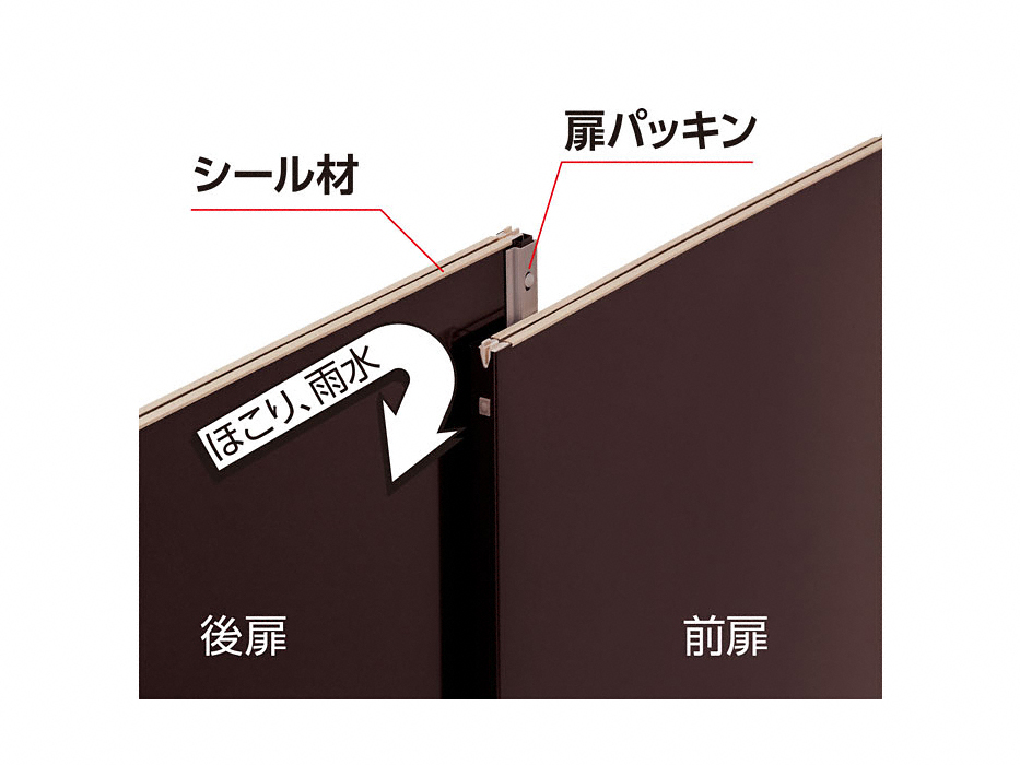 二重構造収納庫 ナイソーシスターKMW 900×580×1103は内装(屋根裏・後板・側板)が目柄の化粧板になっている小型物置です。本体は外壁&内壁の二重構造で、屋根裏と扉には熱や結露に配慮を抑える断熱材が入っています。積雪強度は1800N/㎡(KMW-196,197,216は1200N/㎡、KMW-199,217,219は1000N/㎡)です。