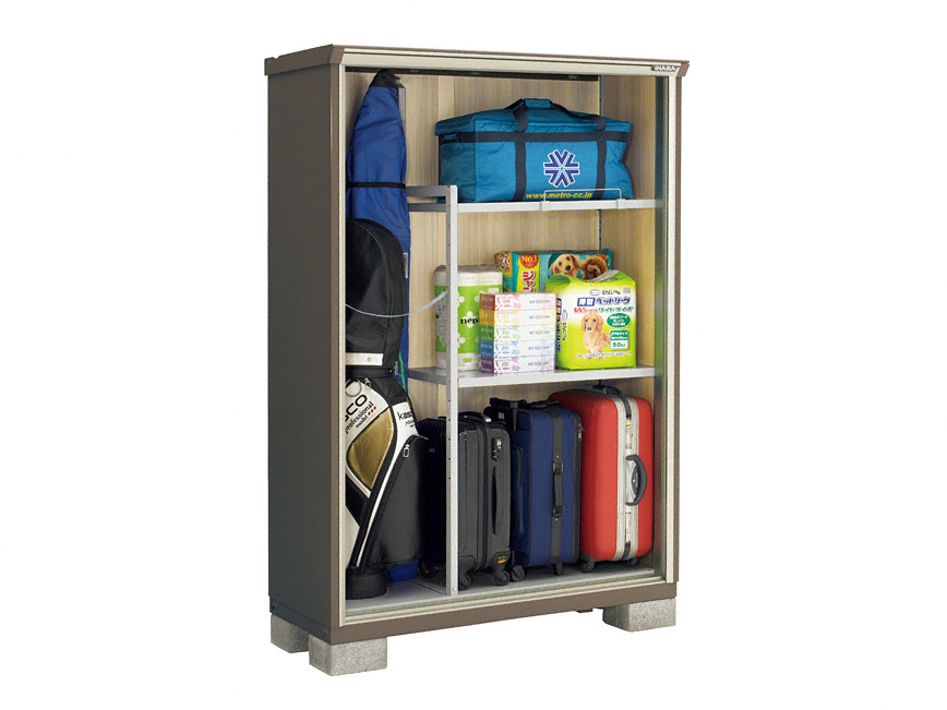 「100人乗っても大丈夫」で有名なイナバ物置の「ナイソーシスター」は、機能性とデザインを兼ね備えたお勧めしたい商品です。収納物に合わせて「全面棚タイプ」と「たて置きタイプ」が選択できるので、ゴルフバックやほうきなど長いものもすっきり収納できます。