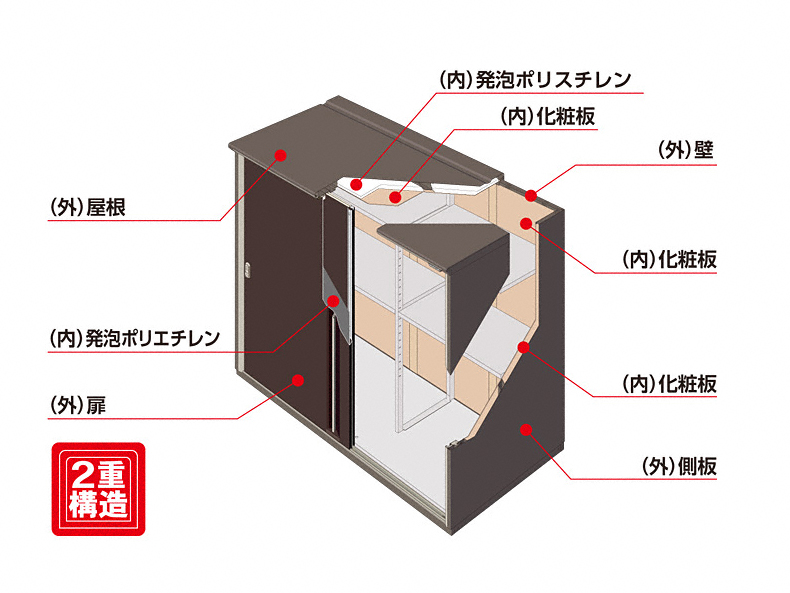上品なデザインで庭先の景観を崩さない便利な物置。お客様の声を反映させた機能も充実させました。扉の合せ目にはパッキンを使用しているので、収納時にほこりや雨水が入りにくく、天井も2重構造で断熱性能に優れているので収納物を安全に保管できます。