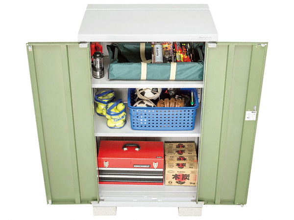全面開口だから、大きな物も出し入れラクラクな物置のアイビーストッカーです。吊り下げフックが標準で2個ついて小物の収納に便利です。丈夫な棚板で高さ調整が5cm単位で決めれます。設置時に水平調整ができるアジャストベース(調整幅0〜32mm)で、多少の勾配もスッキリ設置できます。