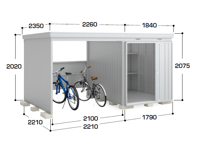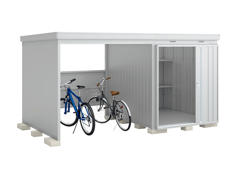 新しい物置の屋根が延長してきたような屋根で開放スペースが一体になった物置です。開放スペースに自転車などを駐輪し、空気入れなど自転車のお手入れに使用するものも保管することができます。
