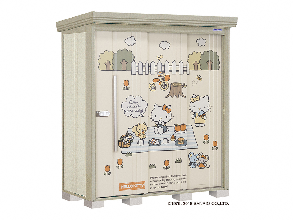 タクボ物置がハローキティとコラボレーションした商品です。ハローキティのプリントにはUVインクジェット技術を使用し、時間がたってもプリントの劣化が少ないのが特徴です。タクボ物置本来の高い耐久性と共に長くお住まいを彩る商品です。
