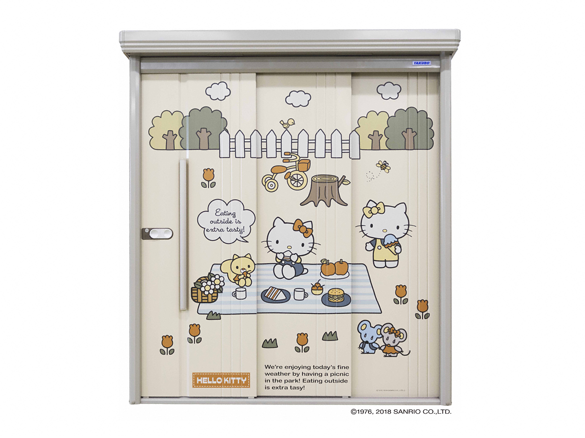 50周年を迎えたタクボ物置がハローキティと限定コラボした商品。ハローキティのプリントにはUVインクジェット技術を使用し、時間がたってもプリントの劣化が少ないのが特徴です。タクボ物置本来の高い耐久性と共に長くお住まいを彩る商品です。