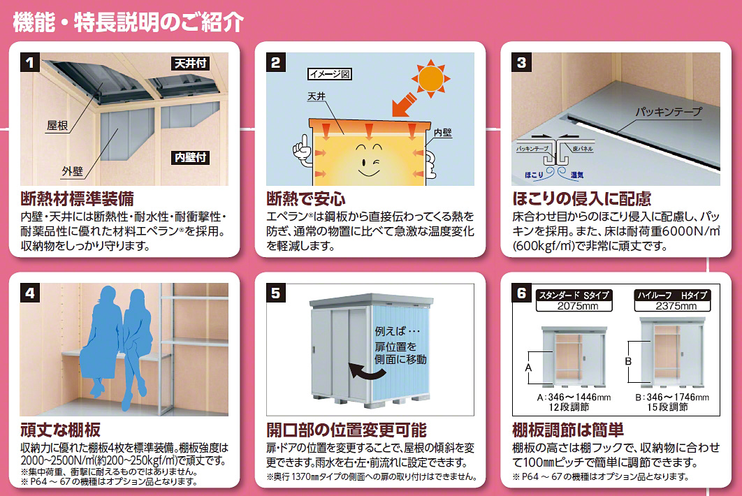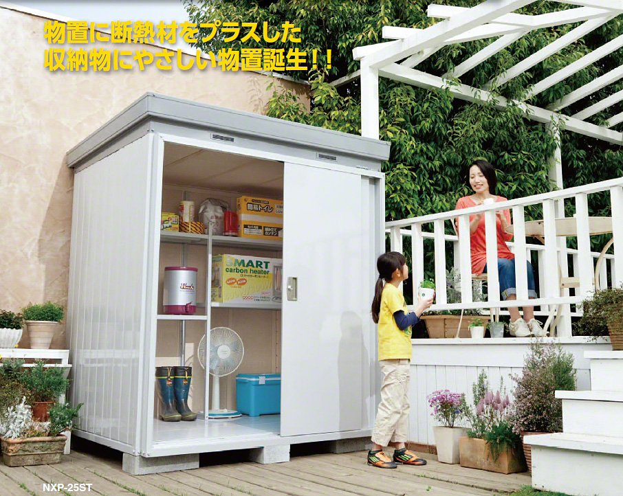 物置に断熱性能をプラスした収納物にやさしい物置誕生。断熱材にはエペランボードを採用し、伝わる熱を防ぎ、急激な温度変化を軽減します。収納場所に困った場合、小物の置き場として活用ができます。