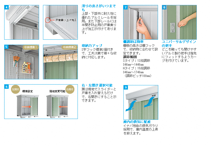 様々なライフスタイルに溶け込む物置ネクスタ。カラーバリエーションが豊富なのも特徴です。奥行き深いタイプは自転車も収納することができます。また、オプションで棚下引き出しを付けて小物を収納したり、側面棚を付けて収納力を3倍にすることもでき対応力に優れています。