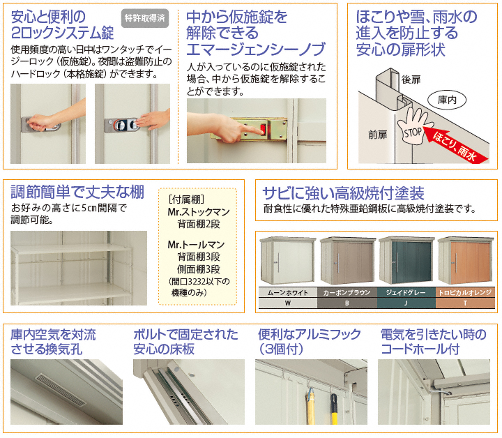 Mr.トールマンダンディは高さが2,570mmで長尺ものの収納力がアップ。扉は連動吊り戸で軽く静かに開閉でき、レールはアルミなので滑らかさもアップ!標準装備の雨水を逃がす樋は、隣家などに雨水が流れ出すのを軽減してくれます。扉の右引き左引きは、組み立てる時に選択できます。積雪100cmまで対応できる多雪型です。