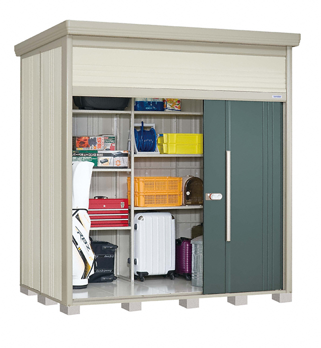 Mr.トールマンダンディは高さが2,570mmで長尺ものの収納力がアップ。扉は連動吊り戸で軽く静かに開閉でき、レールはアルミなので滑らかさもアップ!標準装備の雨水を逃がす樋は、隣家などに雨水が流れ出すのを軽減してくれます。扉の右引き左引きは、組み立てる時に選択できます。積雪100cmまで対応できる多雪型です。