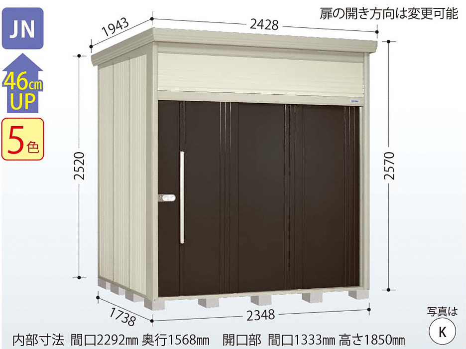 Mr.トールマンダンディは高さが2,570mmで長尺ものの収納力がアップ。扉は連動吊り戸で軽く静かに開閉でき、レールはアルミなので滑らかさもアップ!標準装備の雨水を逃がす樋は、隣家などに雨水が流れ出すのを軽減してくれます。扉の右引き左引きは、組み立てる時に選択できます。積雪60cmまで対応可能な一般型です。