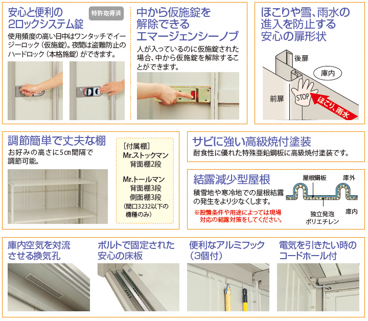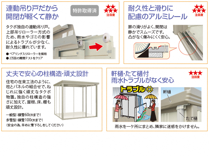 Mr.トールマンダンディは高さが2,570mmで長尺ものの収納力がアップ。扉は連動吊り戸で軽く静かに開閉でき、レールはアルミなので滑らかさもアップ!標準装備の雨水を逃がす樋は、隣家などに雨水が流れ出すのを軽減してくれます。扉の右引き左引きは、組み立てる時に選択できます。寒い時期に発生する屋根の結露を軽減し、積雪は60cmまで対応可能です。