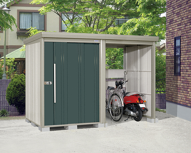 物置に駐輪スペースをプラスしたMr.ストックマン プラスアルファ。設置時に物置部分と解放部分は左右入れ替え可能で、扉は連動吊り戸なので軽く静かに開閉できます。駐輪スペースには車止め棒付きで防犯・雨除けの多機能物置です。積雪対応は100cmまでで、寒い時期に発生する屋根の結露も軽減します。
