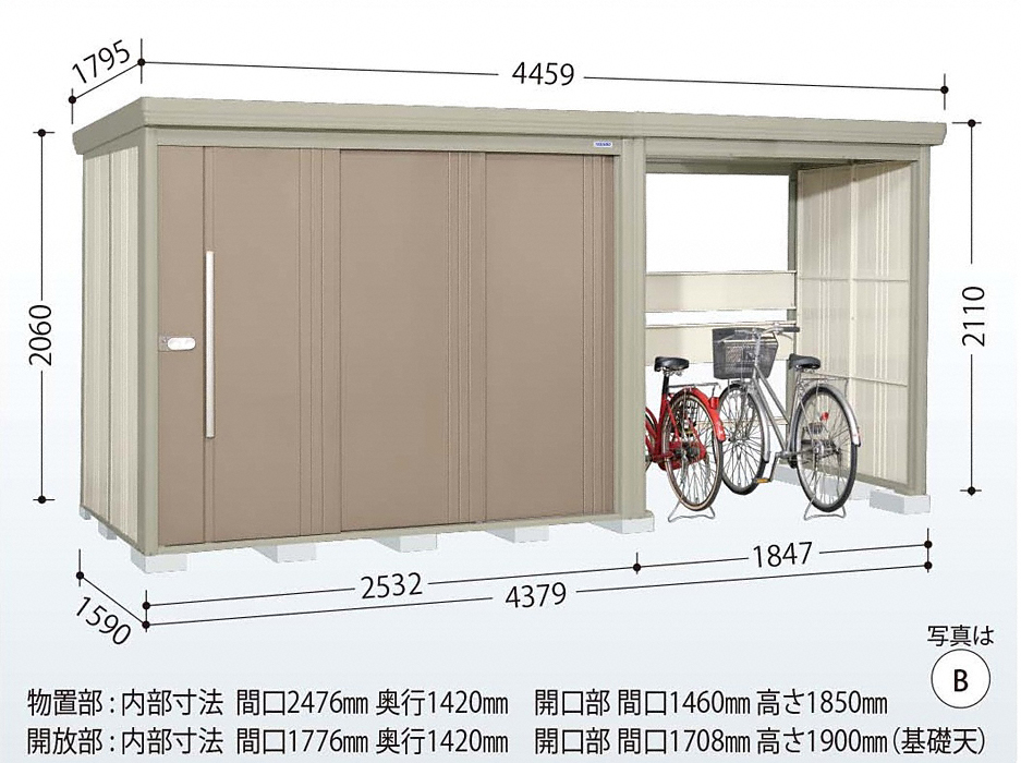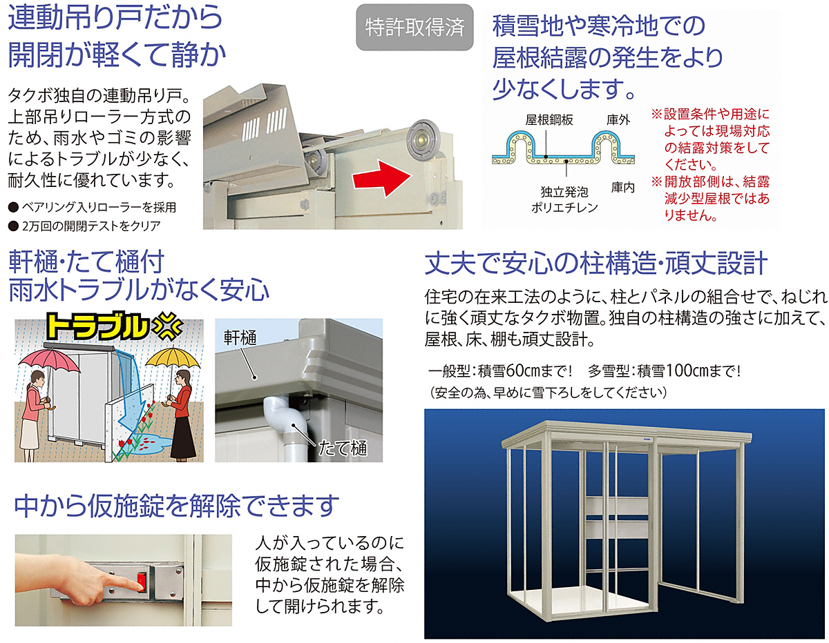 物置に駐輪スペースをプラスしたMr.ストックマン プラスアルファ。設置時に物置部分と解放部分は左右入れ替え可能で、扉は連動吊り戸なので軽く静かに開閉できます。駐輪スペースには車止め棒付きで防犯・雨除けの多機能物置です。積雪対応は100cmまでで、寒い時期に発生する屋根の結露も軽減します。