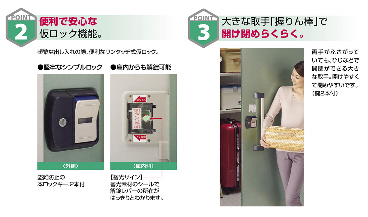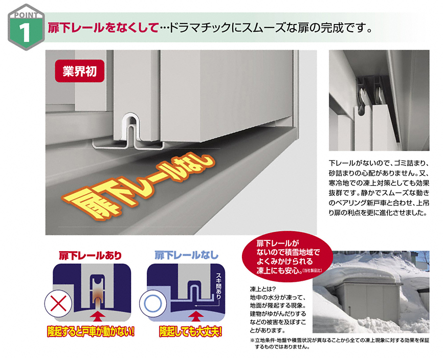 扉下のレールが無いため、地中の水分の凍結などで地面が隆起して物置が歪んで扉を開け閉めしにくくなることを軽減できます。設置場所に応じて、組み立て時に扉の開閉方向を左右いずれかから選ぶこともでき、大きな取っ手「握りん棒」でラクラク開閉できます。100cmまでの積雪に対応可能なあんしん物置です。