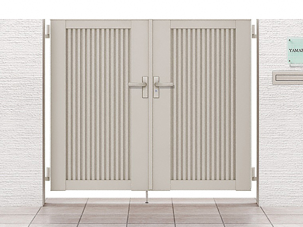 両開きは同じサイズの扉を2枚左右対称に設置したもので、2枚とも開閉可能であるのが特徴です。両方の扉を開けることで開放感を創出します。また、人や物の行き来もスムーズに行うことができます。門扉ABTM2型は縦に溝が入っている完全目隠しタイプの門扉です。