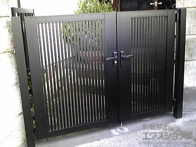 両開きは同じサイズの扉を2枚左右対称に設置したもので、2枚とも開閉可能であるのが特徴です。両方の扉を開けることで開放感を創出します。また、人や物の行き来もスムーズに行うことができます。門扉ABTR1型は約15mmのスリットがある縦格子の門扉です。