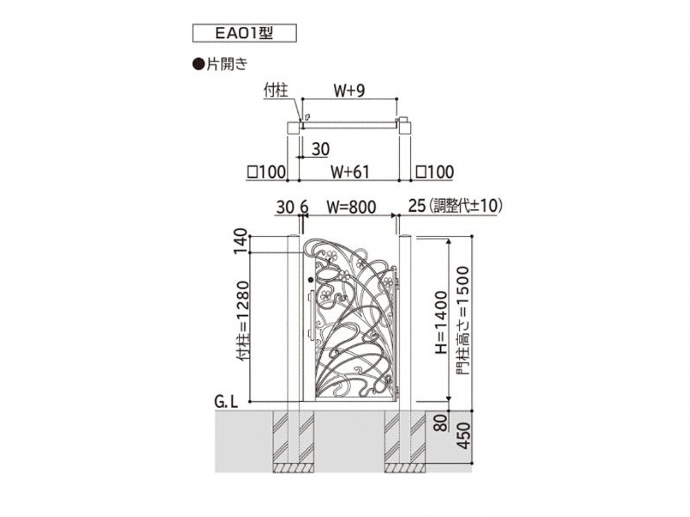 シャローネ門扉 EA01型 片開き アンティーク色は自由曲線デザインの片開き門扉です。自由曲線タイプは表面と裏面で異なるデザインとなっています。デザインはもちろん耐久力も高く、風速34m/s相当の耐風性能(施錠時)を持ち合わせています。※すき間110mm超えの商品です。