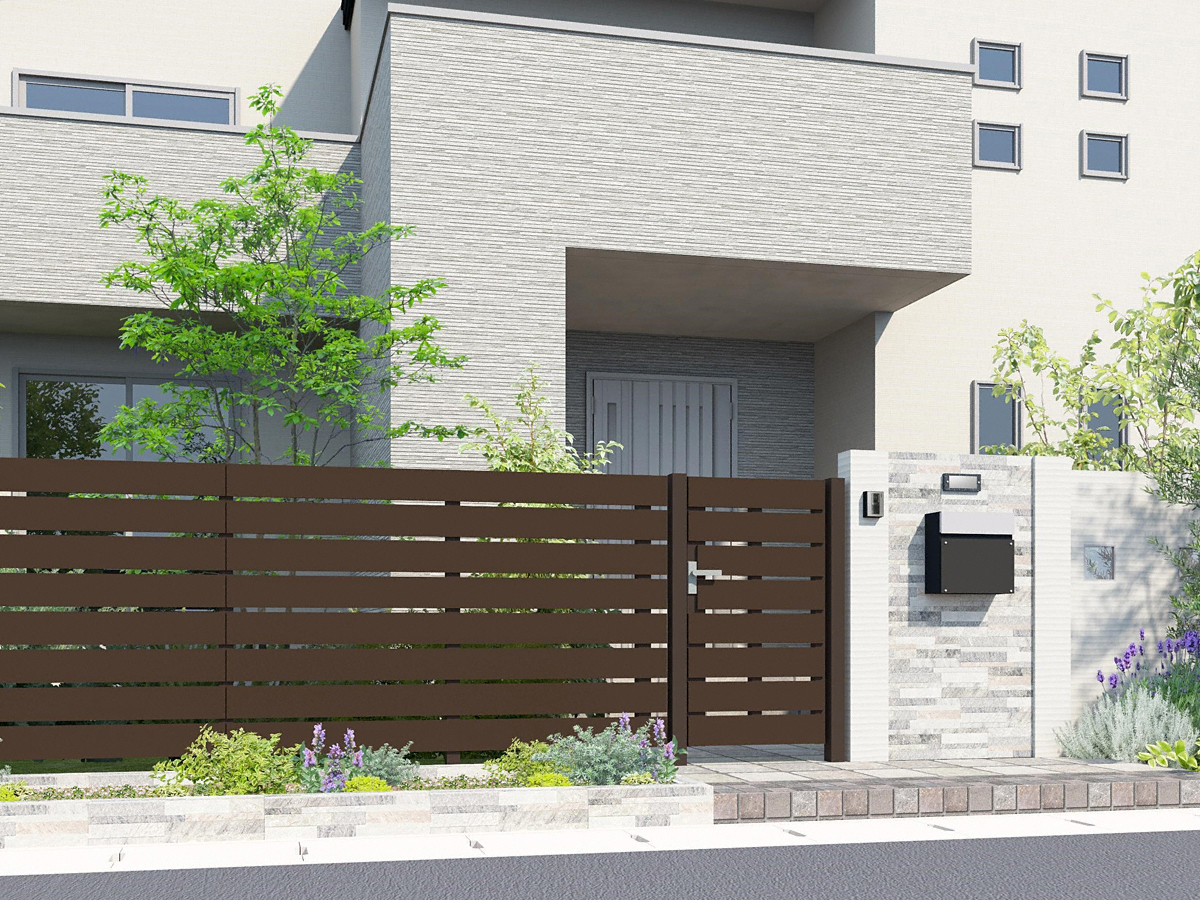 セミユニット門扉 ニコボード門扉 門柱仕様 高尺(すきま5mm)はサイディング加工により天然木を思わせる質感をもつハイタイプ門扉です。色の安定化&耐候性能アップにつながる二層構造になっています。また、ポリエチレン樹脂を素材としており環境にも優しいです。