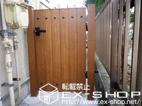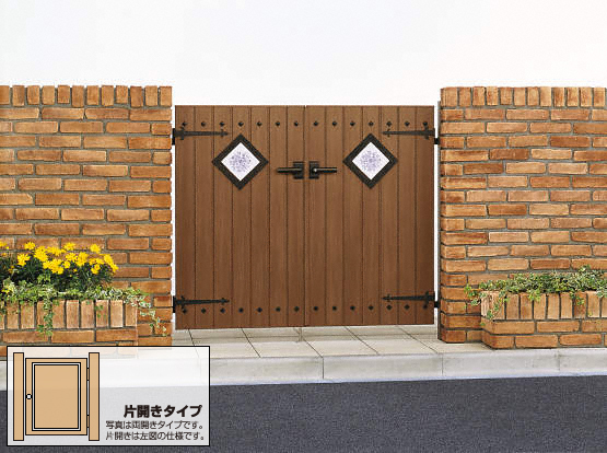 鉄びし調オーナメントと縦パネルが特徴のスタンダード門扉4A型 片開き。表面に木調導管加工を施し天然木の質感を再現。随所に使いやすさと防犯性を配慮した工夫が施され、アルミ形材を使用しているので耐久性、メンテナンス性を確保。