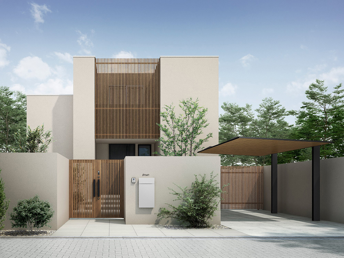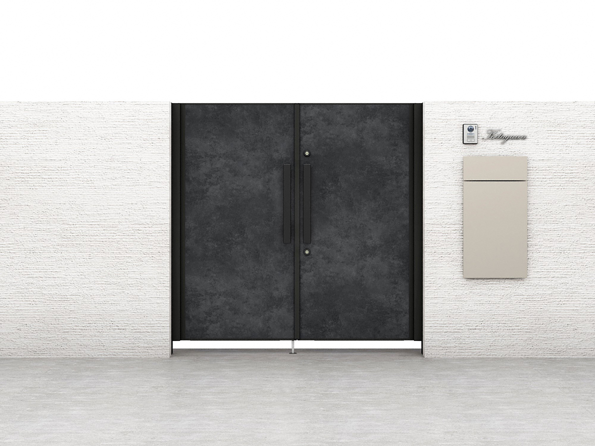 開き門扉AX FM1型 両開きはFLAT DESIGNで生み出されたメタル調の開き門扉です。パネル素材にポリエステル系鋼板を用いており、カラーはブリュームメタルグレーとブリュームメタルブラウンの2色。施錠時は耐風圧強度風速34m/s相当が備わっています。