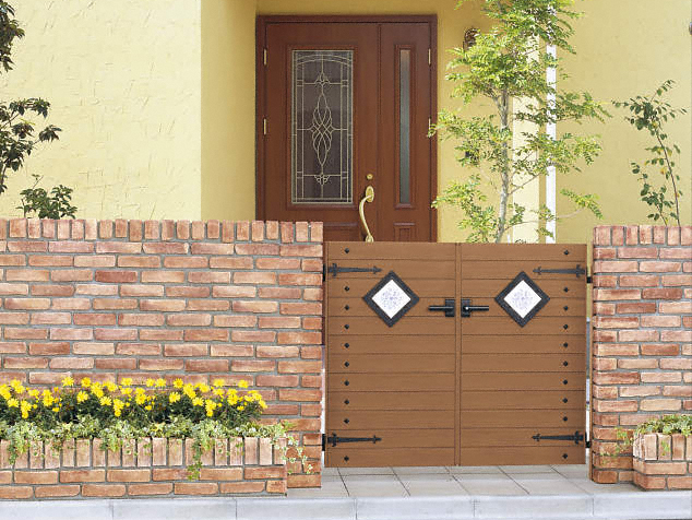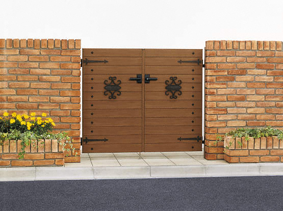 鉄びし調オーナメントと横パネルが特徴のスタンダード門扉3A型 両開き。表面に木調導管加工を施し天然木の質感を再現。随所に使いやすさと防犯性を配慮した工夫が施され、アルミ形材を使用しているので耐久性、メンテナンス性を確保。